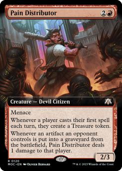 Menace Whenever a player casts their first spell each turn, they create a Treasure token. Whenever an artifact an opponent controls is put into a graveyard from the battlefield, this creature deals 1 damage to that player.