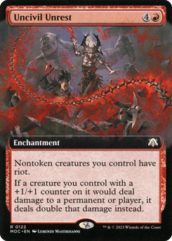 Nontoken creatures you control have riot. (They enter with your choice of a +1/+1 counter or haste.) If a creature you control with a +1/+1 counter on it would deal damage to a permanent or player, it deals double that damage instead.
