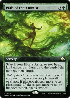Search your library for up to two basic land cards, put them onto the battlefield tapped, then shuffle. Will of the Planeswalkers — Starting with you, each player votes for planeswalk or chaos. If planeswalk gets more votes, planeswalk. If chaos gets more votes or the vote is tied, chaos ensues.
