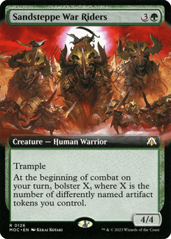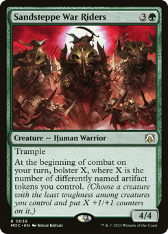Trample At the beginning of combat on your turn, bolster X, where X is the number of differently named artifact tokens you control. (Choose a creature with the least toughness among creatures you control and put X +1/+1 counters on it.)