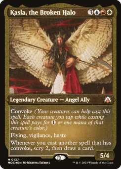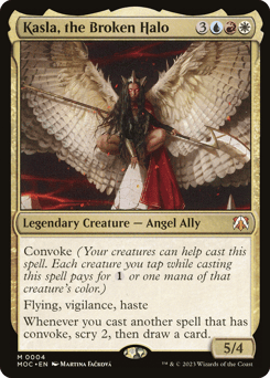 Convoke (Your creatures can help cast this spell. Each creature you tap while casting this spell pays for {1} or one mana of that creature's color.) Flying, vigilance, haste Whenever you cast another spell that has convoke, scry 2, then draw a card.