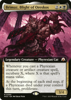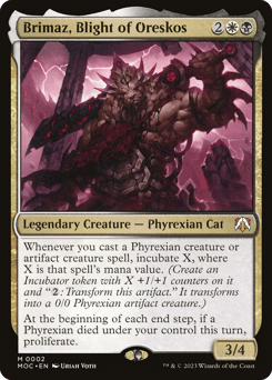 Whenever you cast a Phyrexian creature or artifact creature spell, incubate X, where X is that spell's mana value. (Create an Incubator token with X +1/+1 counters on it and "{2}: Transform this token." It transforms into a 0/0 Phyrexian artifact creature.) At the beginning of each end step, if a Phyrexian died under your control this turn, proliferate.