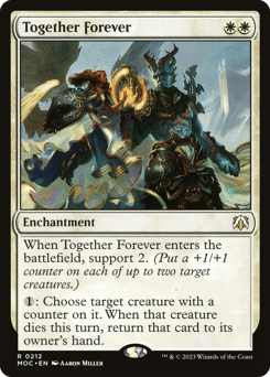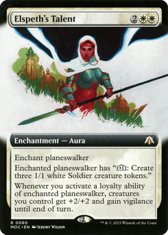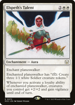 Enchant planeswalker Enchanted planeswalker has "[+1]: Create three 1/1 white Soldier creature tokens." Whenever you activate a loyalty ability of enchanted planeswalker, creatures you control get +2/+2 and gain vigilance until end of turn.