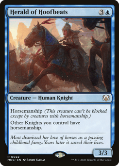 Horsemanship (This creature can't be blocked except by creatures with horsemanship.) Other Knights you control have horsemanship.
