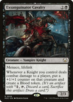 Menace, lifelink Whenever a Knight you control deals combat damage to a player, put a +1/+1 counter on that creature and create a Blood token. (It's an artifact with "{1}, {T}, Discard a card, Sacrifice this token: Draw a card.")