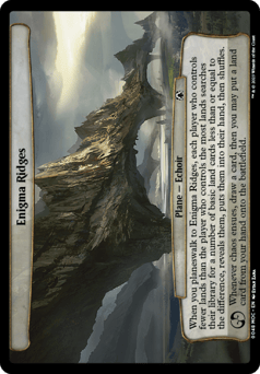 When you planeswalk to Enigma Ridges, each player who controls fewer lands than the player who controls the most lands searches their library for a number of basic land cards less than or equal to the difference, reveals them, puts them into their hand, then shuffles. Whenever chaos ensues, draw a card, then you may put a land card from your hand onto the battlefield.