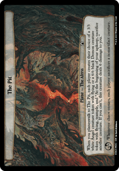 When you planeswalk to The Pit, each player creates their choice of a 3/3 white Angel creature token with flying or a 6/6 black Demon creature token with flying, trample, and "At the beginning of your upkeep, sacrifice another creature. If you can't, this token deals 6 damage to you." Whenever chaos ensues, each player sacrifices a nonartifact creature of their choice.