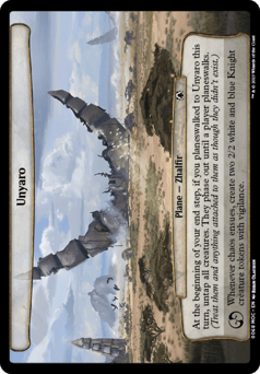 At the beginning of your end step, if you planeswalked to Unyaro this turn, untap all creatures. They phase out until a player planeswalks. (Treat them and anything attached to them as though they didn't exist.) Whenever chaos ensues, create two 2/2 white and blue Knight creature tokens with vigilance.