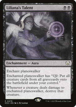 Enchant planeswalker Enchanted planeswalker has "[−8]: Put all creature cards from all graveyards onto the battlefield under your control." Whenever a creature deals damage to enchanted planeswalker, destroy that creature.