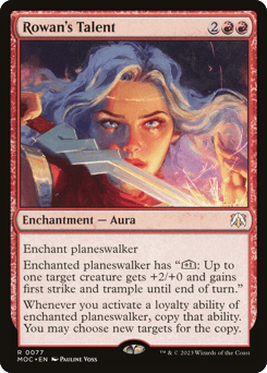 Enchant planeswalker Enchanted planeswalker has "[+1]: Up to one target creature gets +2/+0 and gains first strike and trample until end of turn." Whenever you activate a loyalty ability of enchanted planeswalker, copy that ability. You may choose new targets for the copy.