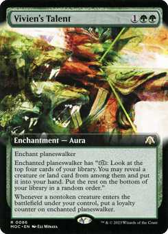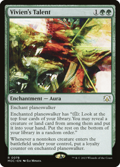 Enchant planeswalker Enchanted planeswalker has "[+1]: Look at the top four cards of your library. You may reveal a creature or land card from among them and put it into your hand. Put the rest on the bottom of your library in a random order." Whenever a nontoken creature you control enters, put a loyalty counter on enchanted planeswalker.