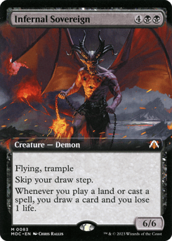 Flying, trample Skip your draw step. Whenever you play a land or cast a spell, you draw a card and you lose 1 life.