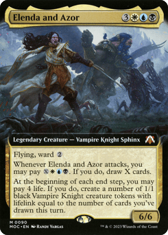 Flying, ward {2} Whenever Elenda and Azor attacks, you may pay {X}{W}{U}{B}. If you do, draw X cards. At the beginning of each end step, you may pay 4 life. If you do, create a number of 1/1 black Vampire Knight creature tokens with lifelink equal to the number of cards you've drawn this turn.
