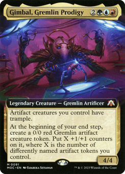 Artifact creatures you control have trample. At the beginning of your end step, create a 0/0 red Gremlin artifact creature token. Put X +1/+1 counters on it, where X is the number of differently named artifact tokens you control.