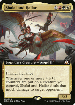 Flying, vigilance Whenever one or more +1/+1 counters are put on a creature you control, Shalai and Hallar deals that much damage to target opponent.