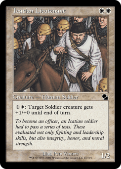 {1}{W}: Target Soldier creature gets +1/+0 until end of turn.