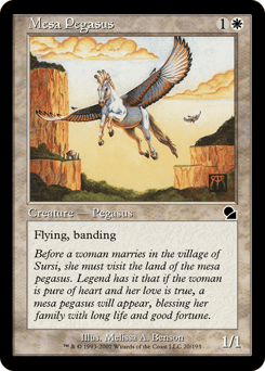 Flying; banding (Any creatures with banding, and up to one without, can attack in a band. Bands are blocked as a group. If any creatures with banding you control are blocking or being blocked by a creature, you divide that creature's combat damage, not its controller, among any of the creatures it's being blocked by or is blocking.)