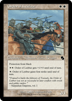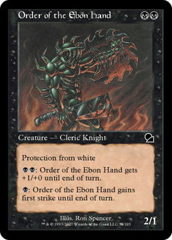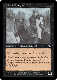 First strike (This creature deals combat damage before creatures without first strike.) Protection from white (This creature can't be blocked, targeted, dealt damage, or enchanted by anything white.)