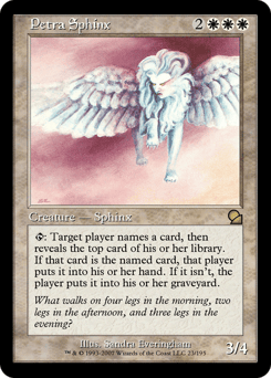 {T}: Target player chooses a card name, then reveals the top card of their library. If that card has the chosen name, that player puts it into their hand. If it doesn't, the player puts it into their graveyard.