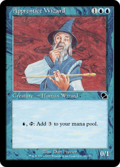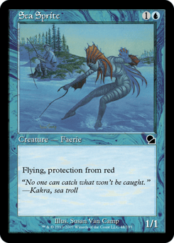 First strike This creature can't attack unless defending player controls an Island. When you control no Islands, sacrifice this creature. {U}: This creature gains flying until end of turn.