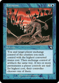 You and target player exchange control of the creature you each control with the greatest mana value. Then exchange control of artifacts the same way. If two or more permanents a player controls are tied for greatest, their controller chooses one of them.