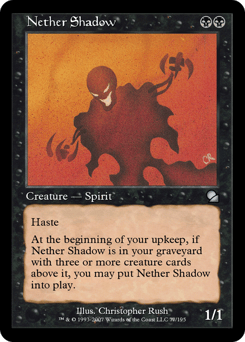 Haste At the beginning of your upkeep, if this card is in your graveyard with three or more creature cards above it, you may put this card onto the battlefield.