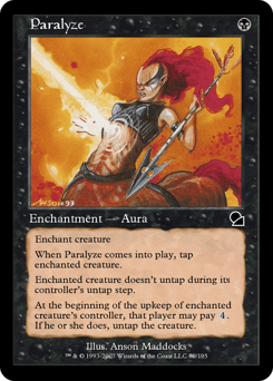Enchant creature When this Aura enters, tap enchanted creature. Enchanted creature doesn't untap during its controller's untap step. At the beginning of the upkeep of enchanted creature's controller, that player may pay {4}. If the player does, untap the creature.