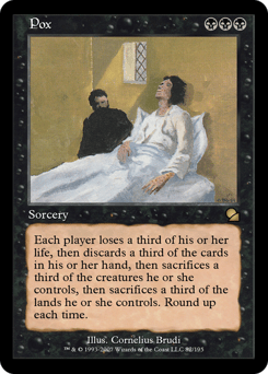 Each player loses a third of their life, then discards a third of the cards in their hand, then sacrifices a third of the creatures they control of their choice, then sacrifices a third of the lands they control of their choice. Round up each time.