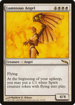 Flying At the beginning of your upkeep, you may create a 1/1 white Spirit creature token with flying.