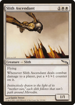 Flying Whenever this creature deals combat damage to a player, put a +1/+1 counter on it.