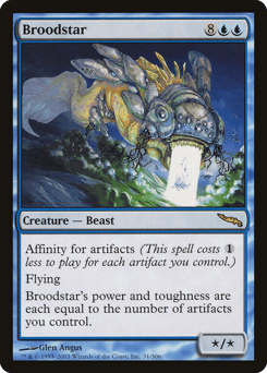 Affinity for artifacts (This spell costs {1} less to cast for each artifact you control.) Flying Broodstar's power and toughness are each equal to the number of artifacts you control.