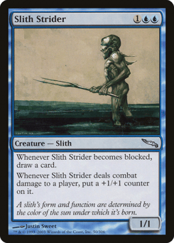 Whenever this creature becomes blocked, draw a card. Whenever this creature deals combat damage to a player, put a +1/+1 counter on it.