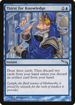 Draw three cards. Then discard two cards unless you discard an artifact card.