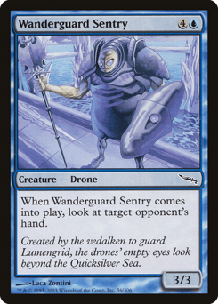 Flying When this creature enters, reveal the top card of your library. If it's an artifact card, put it into your hand. Otherwise, put it into your graveyard.