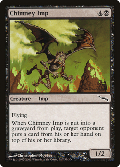 Flying When this creature dies, target opponent puts a card from their hand on top of their library.