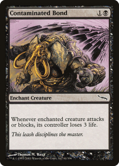 Enchant creature (Target a creature as you cast this. This card enters attached to that creature.) Whenever enchanted creature attacks or blocks, its controller loses 3 life.