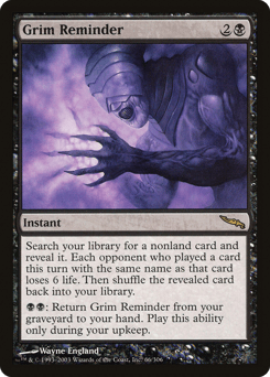 Search your library for a nonland card and reveal it. Each opponent who cast a spell this turn with the same name as that card loses 6 life. Then shuffle. {B}{B}: Return this card from your graveyard to your hand. Activate only during your upkeep.