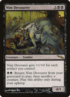 This creature gets +1/+0 for each artifact you control. {B}{B}: Return this card from your graveyard to the battlefield, then sacrifice a creature. Activate only during your upkeep.