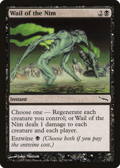Choose one — • Regenerate each creature you control. • Wail of the Nim deals 1 damage to each creature and each player. Entwine {B} (Choose both if you pay the entwine cost.)