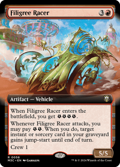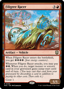 When this Vehicle enters, you get {E}{E}{E}{E} (four energy counters). Whenever this Vehicle attacks, you may pay {E}{E}. When you do, target instant or sorcery card in your graveyard gains jump-start until end of turn. (You may cast that card from your graveyard by discarding a card in addition to paying its other costs. Then exile it.) Crew 1