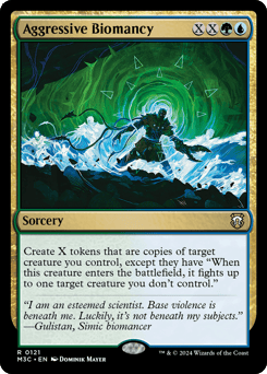 Create X tokens that are copies of target creature you control, except they have "When this token enters, it fights up to one target creature you don't control."