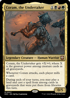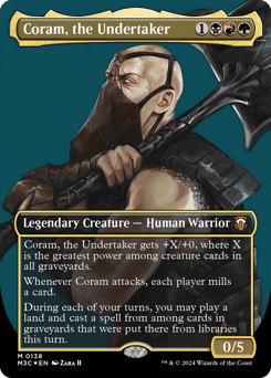 Coram gets +X/+0, where X is the greatest power among creature cards in all graveyards. Whenever Coram attacks, each player mills a card. During each of your turns, you may play a land and cast a spell from among cards in graveyards that were put there from libraries this turn.