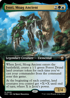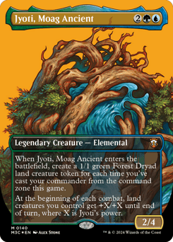 When Jyoti enters, create a 1/1 green Forest Dryad land creature token for each time you've cast your commander from the command zone this game. (They're affected by summoning sickness.) At the beginning of each combat, land creatures you control get +X/+X until end of turn, where X is Jyoti's power.