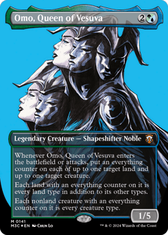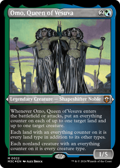 Whenever Omo enters or attacks, put an everything counter on each of up to one target land and up to one target creature. Each land with an everything counter on it is every land type in addition to its other types. Each nonland creature with an everything counter on it is every creature type.