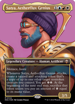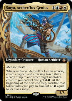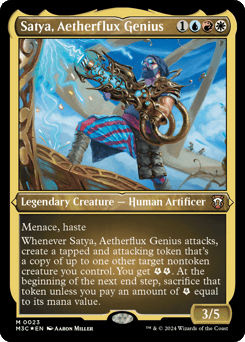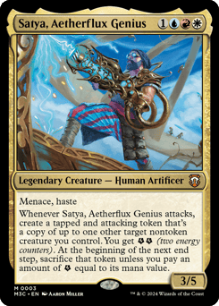Menace, haste Whenever Satya attacks, create a tapped and attacking token that's a copy of up to one other target nontoken creature you control. You get {E}{E} (two energy counters). At the beginning of the next end step, sacrifice that token unless you pay an amount of {E} equal to its mana value.