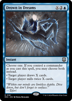 Choose one. If you control a commander as you cast this spell, you may choose both instead. • Target player draws X cards. • Target player mills twice X cards.