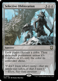 Each player chooses a color. Then exile each permanent unless it's colorless or it's only the color its controller chose.