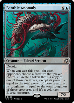 Devoid (This card has no color.) When you cast this spell, for each opponent, choose a creature that player controls. Create a token that's a copy of one of those creatures, except its power is equal to the total power of those creatures, its toughness is equal to the total toughness of those creatures, and it's a colorless Eldrazi creature.