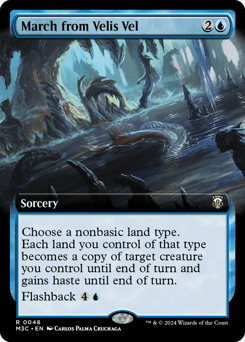 Choose a nonbasic land type. Each land you control of that type becomes a copy of target creature you control until end of turn and gains haste until end of turn. Flashback {4}{U} (You may cast this card from your graveyard for its flashback cost. Then exile it.)