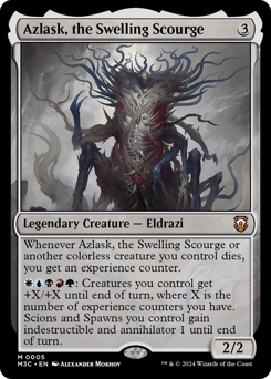 Whenever Azlask or another colorless creature you control dies, you get an experience counter. {W}{U}{B}{R}{G}: Creatures you control get +X/+X until end of turn, where X is the number of experience counters you have. Scions and Spawns you control gain indestructible and annihilator 1 until end of turn.